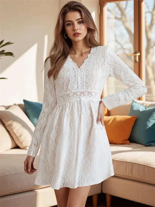 Women Lace Mini Dress Flared Long Sleeve V Neck Irregular Ruffle A-line Mini Dress Summer Fall Sexy Elegant Sundress